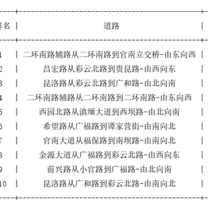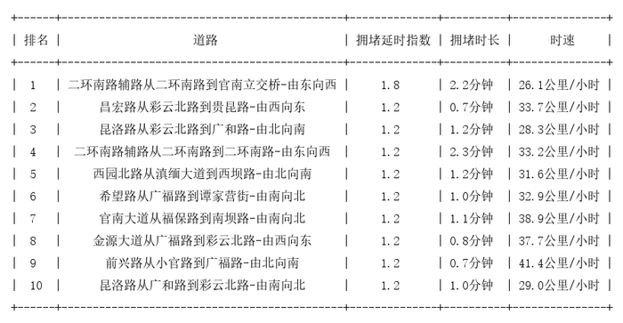 昆明道路拥堵排行榜top10:
