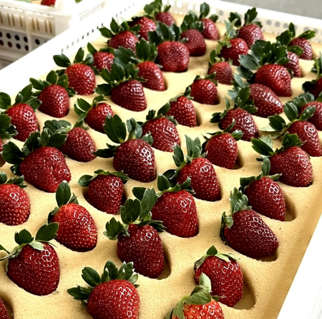 颜色:全身通红均匀,果蒂周围无发白(“白屁股”草莓是未熟透);