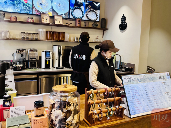 “妈妈,你可以点这个清咽露,配料是青果、薄荷、罗汉果,正好适合缓解咳嗽症状。”1月23日,泸州市中医医院旁的“泸暙”养生铺内,刚陪同母亲取完体检报告的市民刘女士,熟练地为家人下单后,又把目光转向本草茶咖陈列区挑选适合自己的饮品。