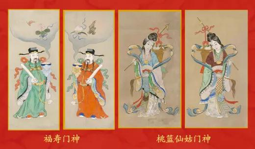 门神为清人画福寿文门神和仙姑门神两对,一大一小,室内外均可贴挂。