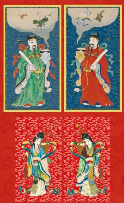 门神为清人画福寿文门神和仙姑门神两对,一大一小,室内外均可贴挂。