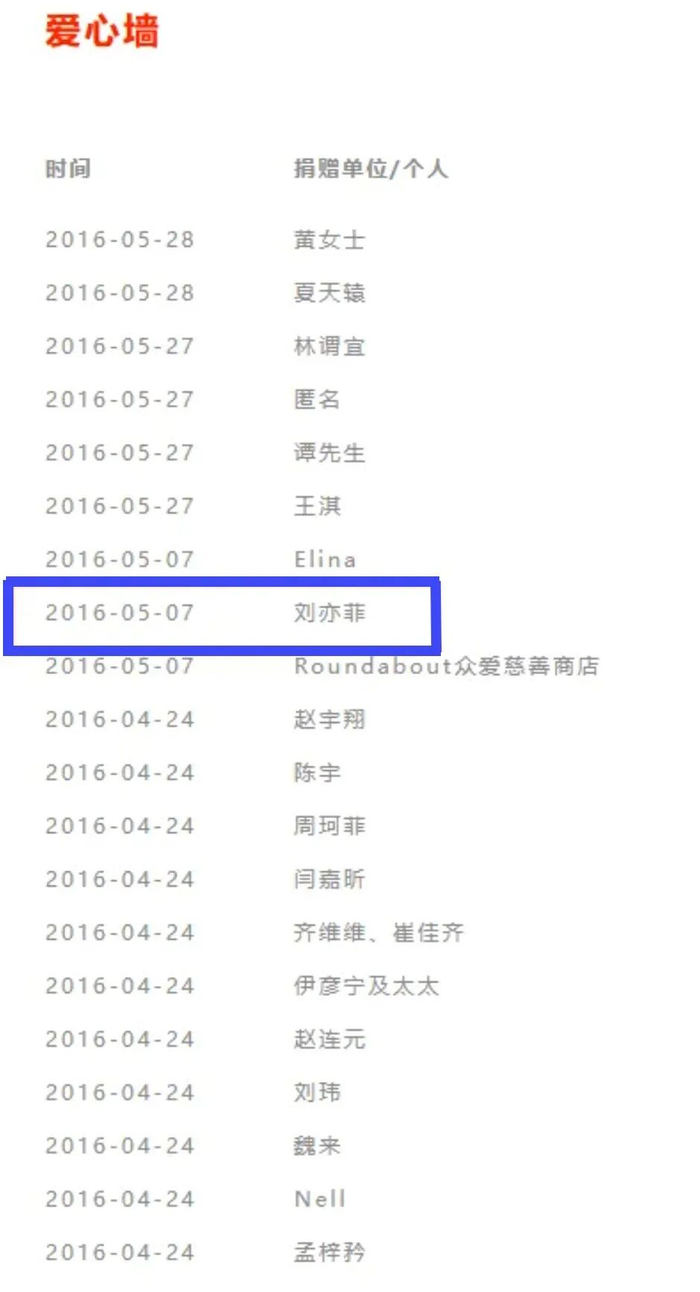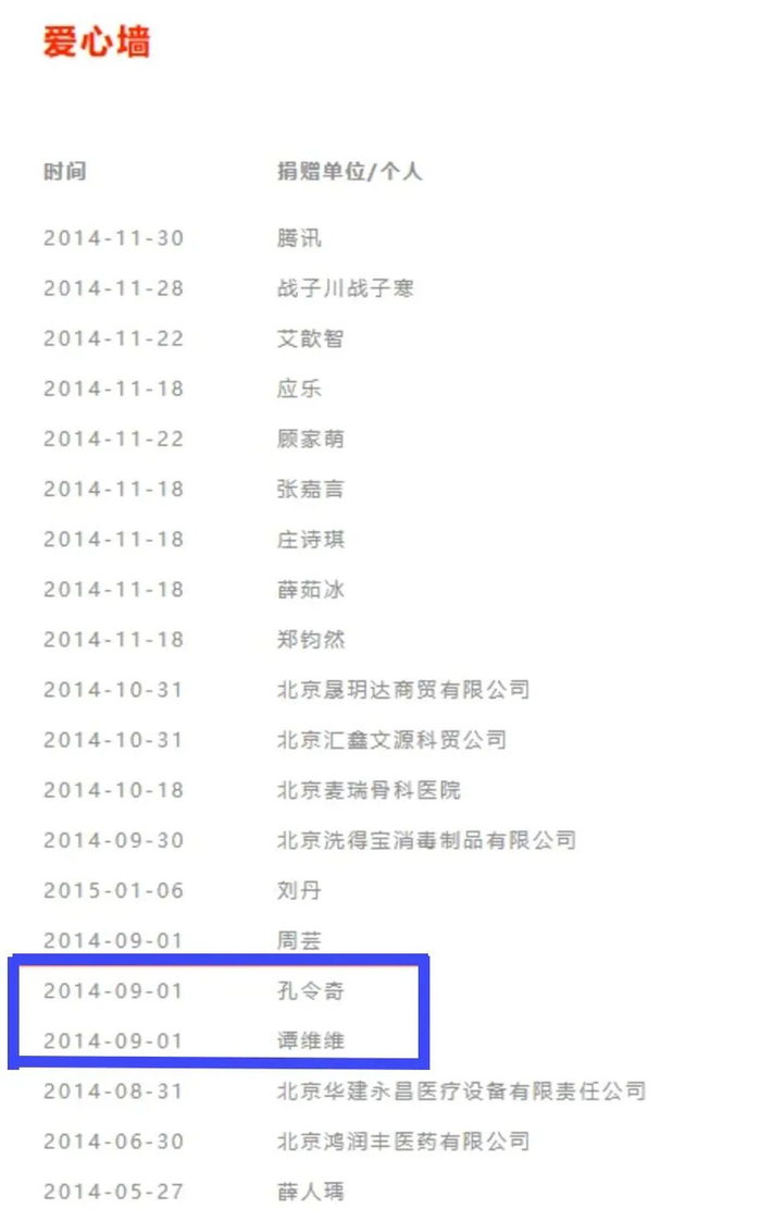 记者在北京嫣然天使儿童医院官网的爱心墙名单中看见,演员刘亦菲、歌手谭维维、孔令奇等人,也曾在医院落成后为医院捐款。
