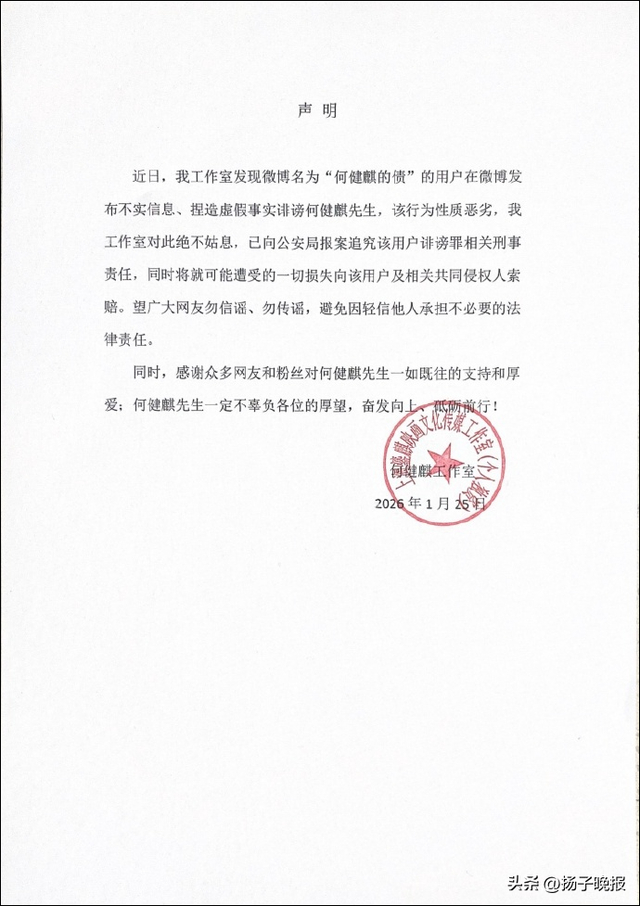 随后,@何健麒SEVEN-7工作室 发布严正声明,称已向公安局报案并追究该用户诽谤罪及相关刑事责任。