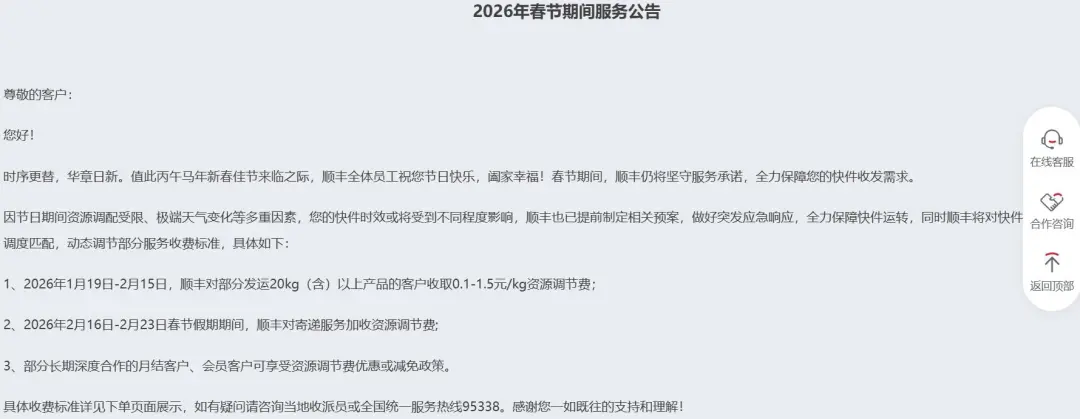 顺丰公告称,因节日期间资源调配受限、极端天气变化等多重因素,快件时效或将受到不同程度影响,将对快件和资源灵活调度匹配,动态调节部分服务收费标准。其中:2026年1月19日—2月15日,顺丰对部分发运20kg(含)以上产品的客户收取0.1—1.5元/kg资源调节费;2026年2月16日—23日春节假期期间,顺丰对寄递服务加收资源调节费。部分长期深度合作的月结客户、会员客户可享受资源调节费优惠或减免政策。