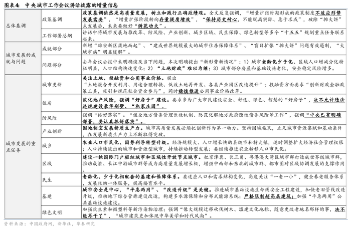 具体问题部分,去年会议公报中未明确谈及当下问题,本次明确提出“新形势新情况”:1)城市老龄化少子化、区域人口增减分化特征明显,人口结构快速变化;2)“土地财政”难以为继;3)城市部分房屋和基础设施安全稳定风险增多。