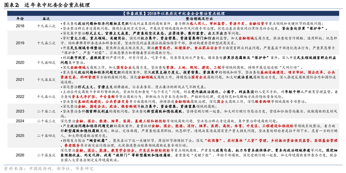 金融、国企、能源、开发区和招投标五个领域连续两年被点名。从重点反腐行业看,金融、国企、能源、开发区和招投标五个领域仍赫然在列,金融反腐更是早在2019年首提后延续至今。相比2025年,今年公报部署中未涉及的部门有消防、烟草、医药、体育、高校、公益慈善、安全生产、工程建设八个行业,新增了教育、学会协会两个部门。
