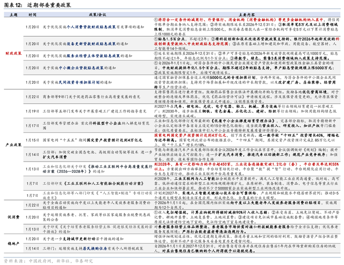 稳增长、扩内需方面,国新办召开多轮发布会,财政出台了贴息/担保政策组合,降低企业融资成本,财政部长蓝佛安提出2026年继续扩大财政支出盘子,支出力度“只增不减”、重点领域保障“只强不弱”。央行结构性降息,下调各类结构性货币政策工具利率0.25个百分点,并同步提高支农支小、科创技改再贷款额度。发改委研究制定出台扩大内需战略实施方案、稳岗扩容提质行动和城乡居民增收计划,促消费的政策空间有望进一步打开。