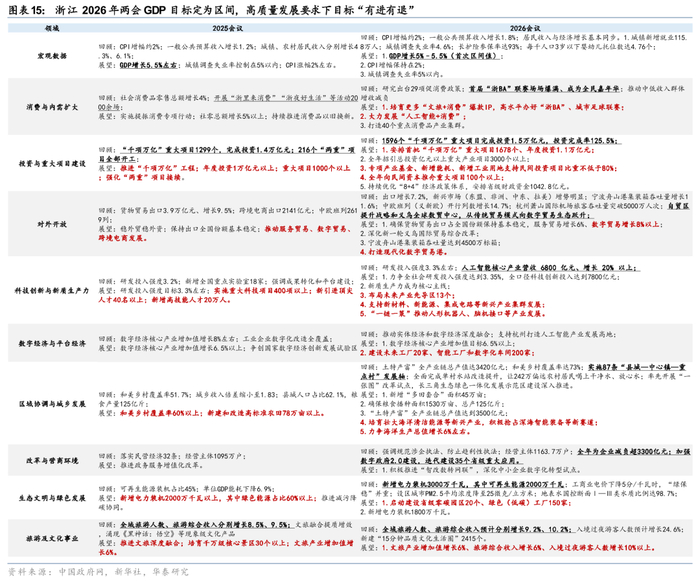 科技创新和产业领域,浙江在前一年高基数基础上,继续上调创新投入和产业升级预期,体现出明显的前瞻布局取向。25年研发投入强度约3.3%较前一年增长1%,今年研发投入强度目标提升至3.35%,较去年高了0.05%,目标增幅有所下降,或更加注重投入效率、成果转化和产业牵引。值得关注的是,2025年人工智能核心产业营收 6800 亿元、增长 20%以上,已成为浙江省经济增长新引擎。