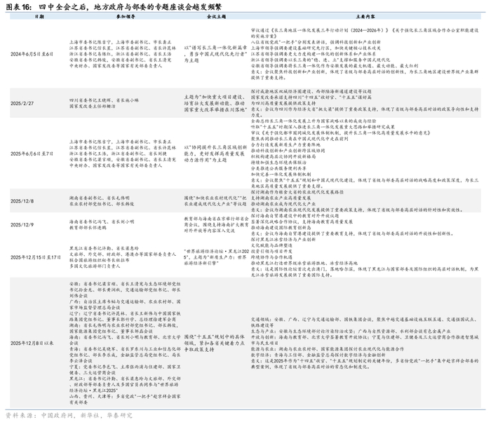 整体看,省委书记与部委召开座谈会,有利于地方结合自身实际,提前争取高层指导与支持。与以往相比,四中全会之后地方和部委的对接频率明显上升。例如,2025 年底,辽宁省委书记许昆林在京主持召开辽宁省与中国人民银行、国家金融监督管理总局及中央金融机构座谈会,就金融支持辽宁经济社会发展、优化金融生态、加强融资支持等具体问题与部委及中央金融机构主要负责同志开展了深入交流。