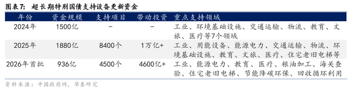 “两新”政策方面,会后迅速下达首批936亿元超长期特别国债资金,用于设备更新,支持约4500个项目,带动总投资超过4600亿元。一方面,通过降门槛、严把关、强监管提升资金使用效率;另一方面,教育、医疗等公共服务领域资金占比明显抬升,住宅老旧电梯改造、新能源公交车更新等被纳入支持范围,凸显投资于人的民生导向。本轮政策靠前发力、规模扩张、结构优化,体现开年稳增长和长期高质量发展的双重目标。