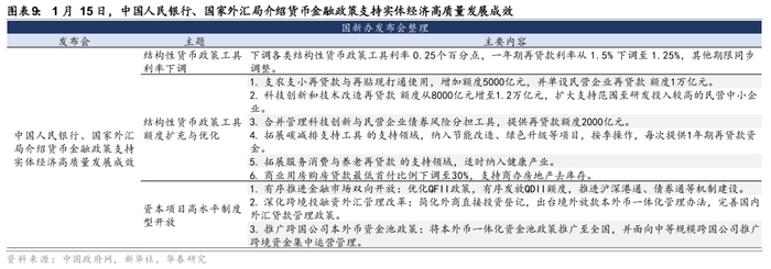 1月15日,央行密集发布多项货币金融政策,从结构性工具的量、价进行调节。①下调各类结构性工具利率0.25个百分点。各类再贷款一年期利率从目前的1.5%下调到1.25%,其他期限档次利率同步调整。②拓展各类结构性工具的覆盖范围,增加或合并额度。③下调商业用房购房贷款最低首付比例至30%。
