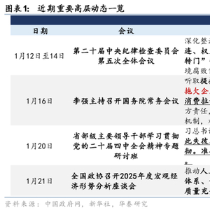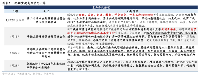 中央党校开年“第一课”和地方政府“开门红”部署构成了1月高层主要政策动向。习总书记在开年“第一课”上强调了读“有字书”和读“无字书”、 “算投入产出账,提高适配度”、开局之年看“正确政绩观”三方面内容。部委层面“扩内需+反内卷”两条政策主线持续推进,地方两会在1月底和2月初密集召开,“树立正确的政绩观”叠加“地方换届”,关注地方政府经济行为和政策取向的结构性变化,尤其是经济增长目标设定和重点任务部署或有进有退,是观察全国两会政策方向的窗口。