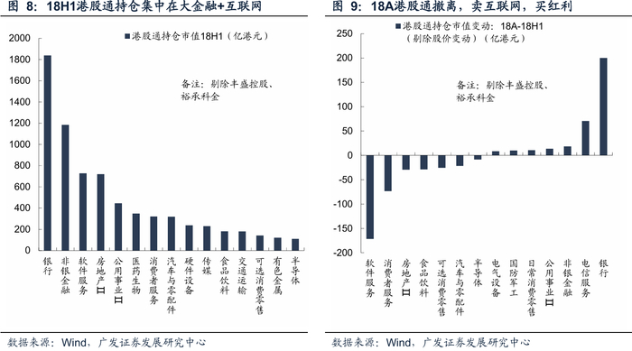 从持仓结构看,2018年上半年港股通资金主要增持险资偏好的红利资产(银行、地产、保险、公用事业)及具备稀缺性的软件服务资产(主要是腾讯控股,持仓达612亿港元)。