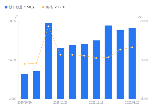 近一年(2025年1月27日至2026年1月20日),京泉华A股股东户数从3.57万户,增加至5.58万户,增幅56.44%,区间股价上涨117.75%。