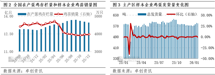 具体来看,供应压力下滑,季节性需求显著提升,1月蛋价强势上涨。由于2025年12月全国在产蛋鸡存栏量环比减少0.59%,且12月老母鸡出栏量增加、新开产蛋鸡数量小于老母鸡出栏量,导致在产蛋鸡存栏量继续压缩,因此1月鸡蛋供应减少,对鸡蛋市场产生利多影响。