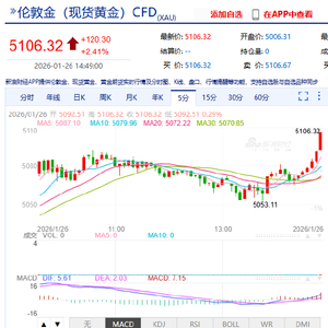 日内大涨110美元,站上5100美元/盎司,涨超2%,现报5106.32美元/盎司。