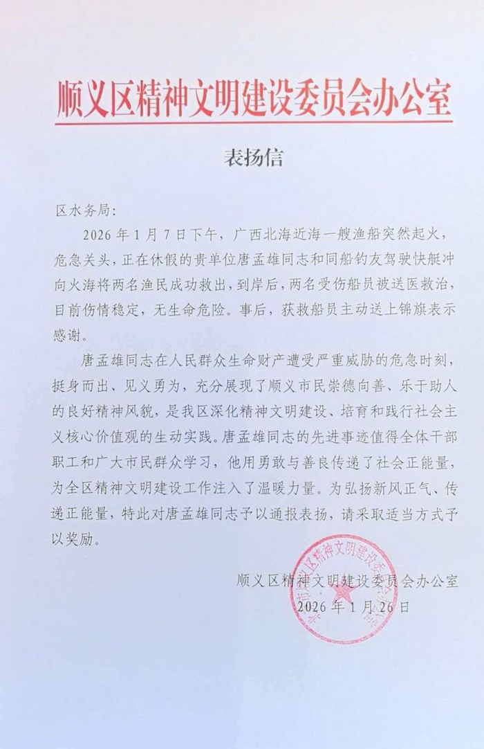 今年1月7日,顺义区水务局温榆河管理段干部唐孟雄在广西北海休假期间,于海上垂钓时突遇一艘渔船爆炸起火。危急关头,他与钓友、快艇驾驶员毫不犹豫展开生死救援,以教科书式的处置成功救出两名被困船员。1月26日下午,为表彰其挺身而出的义举,阿里公益天天正能量联合北京青年报,授予唐孟雄“天天正能量特别奖”,并颁发奖金1万元。顺义区同步向唐孟雄所在单位及其儿子就读的学校寄送表扬信,这也是该区自2023年开展“顺义好风气”建设以来,发出的第4325封表扬信。
