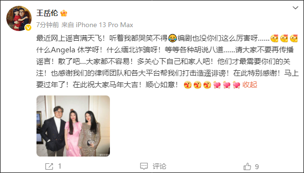 什么Angela休学呀!什么缅北诈骗呀!等等各种胡说八道……请大家不要再传播谣言!散了吧…大家都不容易!多关心下自己和家人吧!他们才最需要你们的关注!也感谢我们的律师团队和各大平台帮我们打击造谣诽谤!在此特别感谢!马上要过年了!在此祝大家马年大吉!顺心如意!