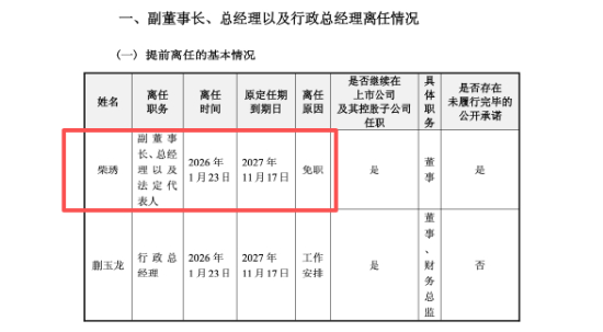 公司披露,1月23日,柴琇被免去副董事长、总经理及法定代表人职务,继续担任董事;原行政总经理蒯玉龙因工作安排离任行政总经理职务,并被董事会聘任为新任总经理及法定代表人,任期至第十二届董事会届满。