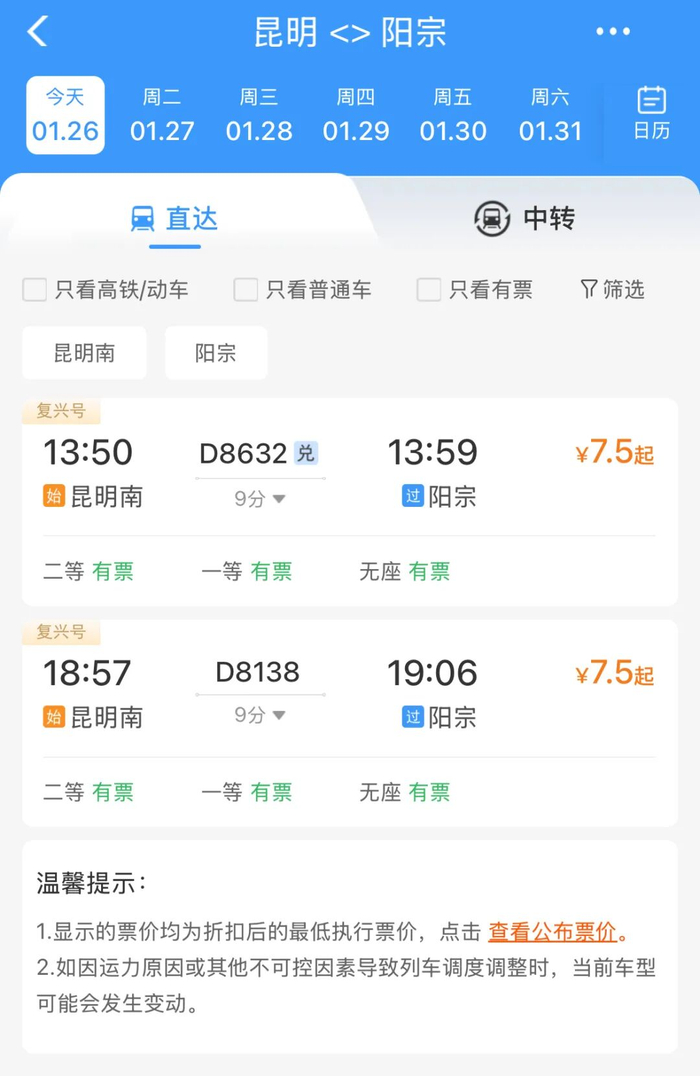 1月26日,云桂高铁阳宗站正式开始办理客运业务,每天将有6趟旅客列车停靠,覆盖早、中、晚三个时段,阳宗站至昆明南站最快仅需10分钟,至昆明站约35分钟,至红河站约1.5小时,至广州南站约8.5小时,更好服务周边群众出行,也更加方便五湖四海的游客来到阳宗海风景名胜区旅游。