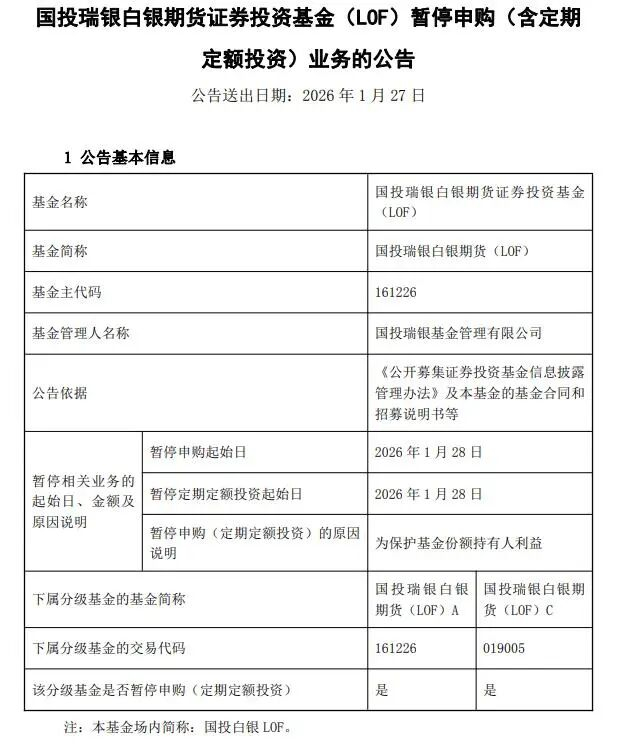 国投白银LOF公告,将于1月28日起暂停申购(含定期定额投资)业务。