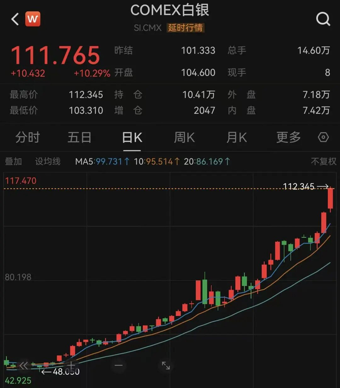 COMEX白银期货涨11%,报112.815美元/盎司,本月累计涨超57%。