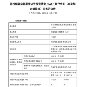 1月26日,国投白银LOF发布公告称,为保护基金份额持有人利益,将于1月28日起暂停申购(含定期定额投资)业务。