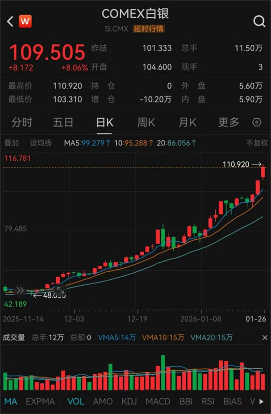 1月26日,白银价格仍在走高,现货、期货一度双双站上110美元/盎司。截至发稿,COMEX白银报109.505美元/盎司,涨幅超8%;伦敦银报109.057美元/盎司,涨幅超5.5%。