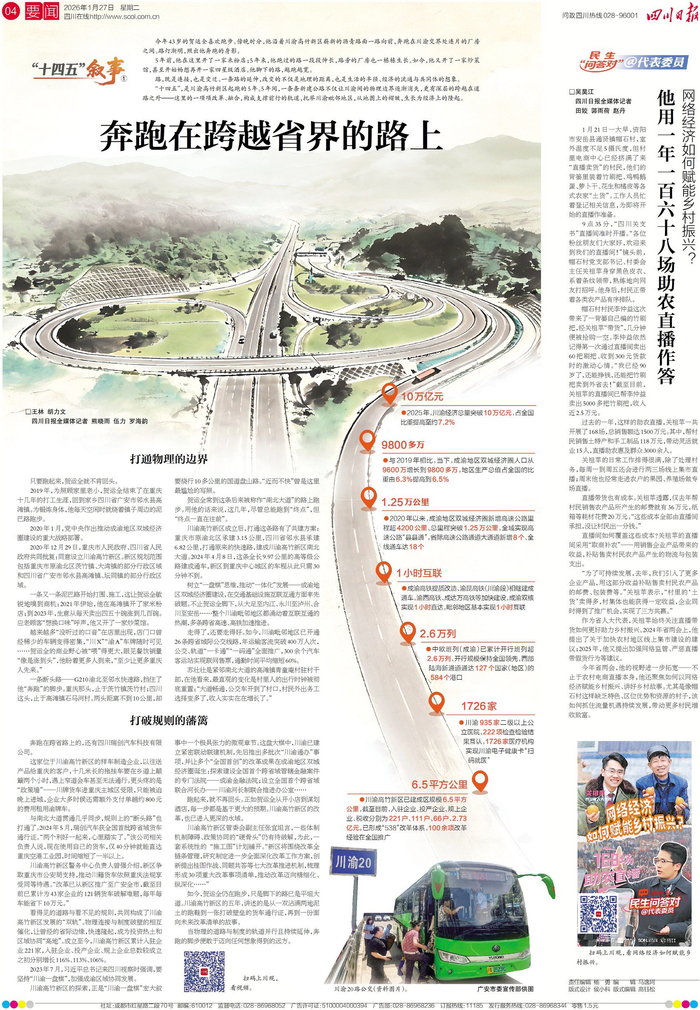今日的第二份推荐,是四版新开栏的“十四五叙事”首篇——在川渝高竹新区,市民贺运全常在这条越来越长的跨省通道上跑步。五年来,他看着路边厂房生长,自己的生意也从米粉店变成炒菜馆,如今甚至“敢想”开一家酒店。