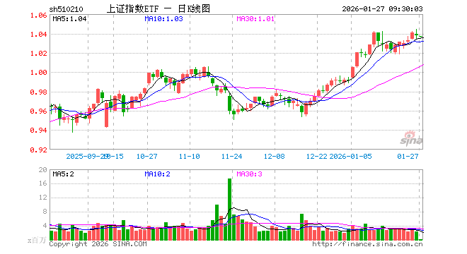 1月27日,上证指数ETF(510210)开盘跌0.10%,报1.037元。上证指数ETF(510210)重仓股方面,农业银行开盘涨0.58%,中国石油涨0.00%,贵州茅台涨0.22%,工业富联涨0.42%,中国银行涨0.00%,紫金矿业涨1.85%,中国神华涨0.02%,中国人寿涨0.15%,招商银行涨0.11%,中国平安涨0.27%。