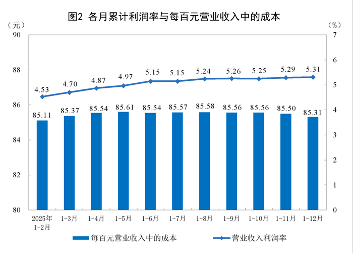 2025年,规模以上工业企业每百元营业收入中的成本为85.31元,比上年增加0.16元;每百元营业收入中的费用为8.62元,比上年减少0.02元。