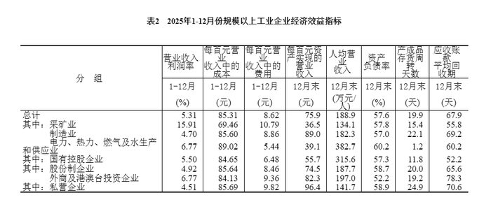 2025年末,规模以上工业企业每百元资产实现的营业收入为75.9元,比上年末减少2.7元;人均营业收入为188.9万元,比上年末增加5.5万元;产成品存货周转天数为19.9天,比上年末增加0.6天;应收账款平均回收期为67.9天,比上年末增加3.6天。