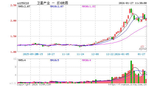 1月27日,截止午间收盘,卫星产业ETF(159218)涨0.05%,报2.055元,成交额4.03亿元。卫星产业ETF(159218)重仓股方面,中国卫星截止午盘跌1.62%,航天电子涨3.32%,中国卫通涨1.65%,中科星图跌1.35%,臻镭科技跌0.61%,华测导航涨1.11%,北斗星通跌0.97%,国博电子跌0.87%,北方导航跌0.58%,新雷能涨1.75%。