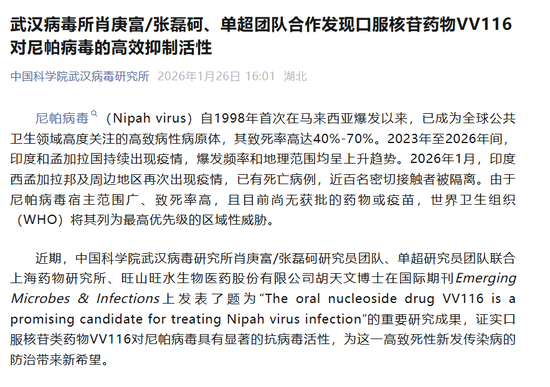 1月26日,中国科学院武汉病毒研究所微信公众号发文称,近期,中国科学院武汉病毒研究所肖庚富/张磊砢研究员团队、单超研究员团队联合上海药物研究所、旺山旺水生物医药股份有限公司胡天文博士在国际期刊发表的重要研究成果,证实口服核苷类药物VV116对尼帕病毒具有显著的抗病毒活性,为这一高致死性新发传染病的防治带来新希望。该成果首次证实VV116对尼帕病毒的治疗潜力,不仅可作为医护人员、实验室工作者等高危人群的预防性用药,更可为应对当下和未来的尼帕病毒疫情提供了一个现成的药物选择。