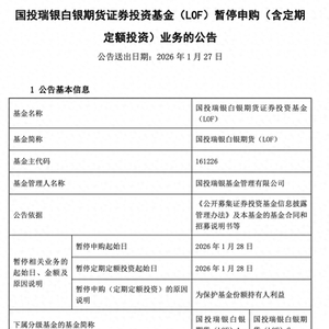 1月27日,国投瑞银白银LOF(下称“白银LOF”)公告称,为保护基金份额持有人利益,将于1月28日起暂停申购(含定期定额投资)业务。