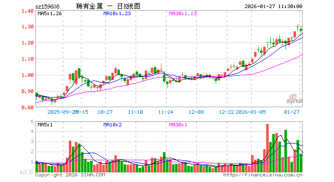 1月27日,截止午间收盘,稀有金属ETF(159608)跌2.38%,报1.269元,成交额2.27亿元。稀有金属ETF(159608)重仓股方面,洛阳钼业截止午盘涨1.50%,北方稀土跌2.28%,华友钴业跌1.72%,盐湖股份跌2.67%,赣锋锂业跌1.75%,天齐锂业跌2.35%,中矿资源跌4.11%,厦门钨业跌1.39%,中国稀土跌4.75%,西部超导涨0.44%。
