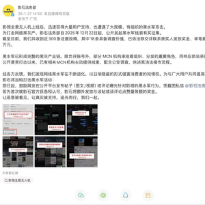 1月27日下午,@影石法务部官方微博账号发文称,影翎全景无人机上线后,遭遇了大规模、有组织的黑水军攻击。为打击网络黑灰产,影石法务部自2025年12月22日起,公开发起黑水军线索有奖征集。截至目前,共收到近300条证据投稿,其中18条具备调查价值,已依法移交并联系获奖人发放奖金,单笔最高奖励达1万元。