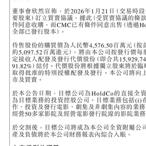 近日,邵氏兄弟股份(00953.HK)发布公告称,公司与主要股东华人文化(CMC Inc.)订立买卖协议,拟以发行代价股份方式收购华人文化旗下核心资产,交易对价达45.765亿元人民币(约合50.98亿港元)。