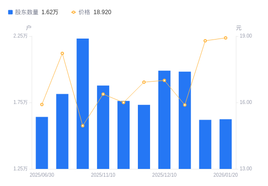 近一年(2025年2月28日至2026年1月20日),横店影视A股股东户数从2.29万户,减低至1.62万户,降幅29.01%,区间股价上涨35.63%。