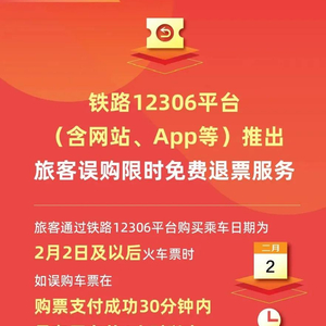 1月19日起,铁路12306平台(含网站、App等,下同)推出旅客误购限时免费退票服务,旅客通过铁路12306平台购买乘车日期为2月2日及以后火车票时,如误购车票,在购票支付成功30分钟内且在开车前4小时以上,购票人可线上自助办理退票,不收取退票费。