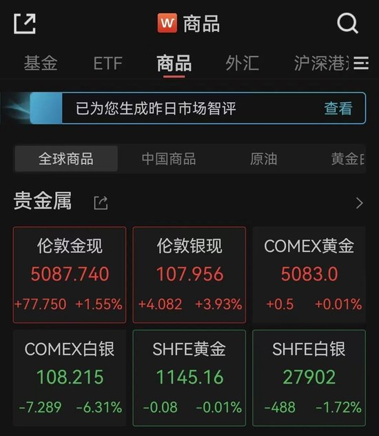 最后来看贵金属市场,伦敦黄金和白银现货价格双双大涨,截至发稿涨幅分别达1.55%和3.93%,但COMEX白银期货价格大跌6.31%。