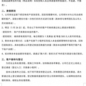 1月24日,平台负责人张某曾通过视频安抚投资者,称以“官方小程序首页弹窗为准”。次日,杰我睿公告称,已主动申请政府部门对全部资产进行监管,并强调资产未被转移,并将每日兑付金额限定为1克黄金或等值500元现金,具体处置方案仍需协商,预计需7至15天方可处理。