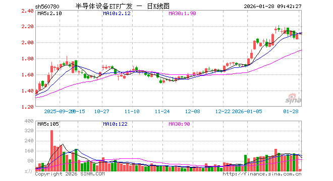 1月28日,半导体设备ETF广发(560780)开盘涨0.19%,报2.101元。半导体设备ETF广发(560780)重仓股方面,北方华创开盘涨0.95%,中微公司涨2.50%,拓荆科技涨1.01%,长川科技涨0.42%,沪硅产业涨0.63%,华海清科涨0.92%,中科飞测涨0.00%,南大光电涨0.07%,安集科技涨0.88%,芯源微跌0.00%。