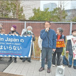 日本民众在东京的自民党总部大楼前参加抗议活动,反对高市政府企图为武器出口大幅“松绑”。记者 刘文璋 摄