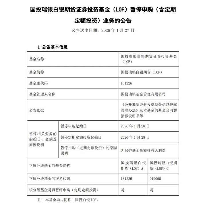 1月26日,国投白银LOF公告,将于1月28日起暂停申购(含定期定额投资)业务。