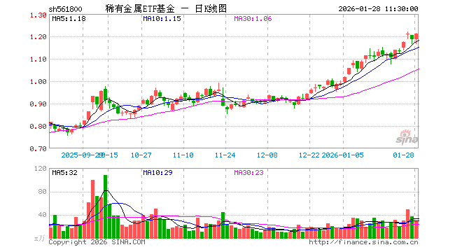 1月28日,截止午间收盘,稀有金属ETF基金(561800)涨2.11%,报1.212元,成交额3470.88万元。稀有金属ETF基金(561800)重仓股方面,洛阳钼业截止午盘涨5.27%,北方稀土涨1.93%,华友钴业涨3.58%,盐湖股份涨0.74%,赣锋锂业跌0.41%,天齐锂业跌0.77%,中矿资源跌0.65%,厦门钨业涨1.53%,中国稀土涨0.31%,西部超导跌1.10%。