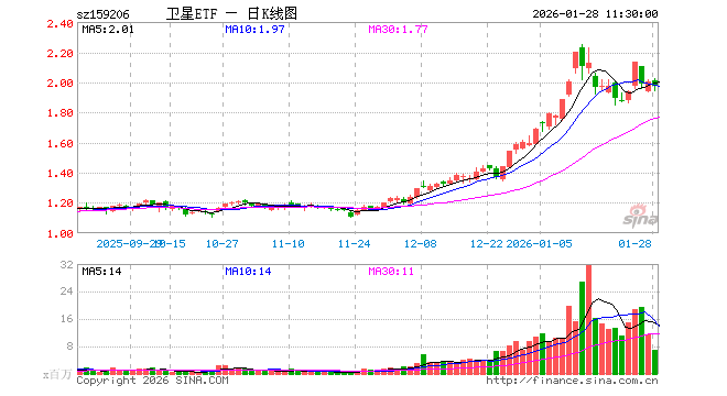 1月28日,截止午间收盘,卫星ETF(159206)跌1.45%,报1.973元,成交额13.59亿元。卫星ETF(159206)重仓股方面,中国卫星截止午盘跌1.85%,航天电子跌5.01%,睿创微纳跌2.71%,信维通信跌3.01%,复旦微电跌1.79%,上海瀚讯跌0.53%,臻镭科技涨3.15%,海格通信跌2.81%,中国卫通跌2.37%,卓胜微涨0.46%。