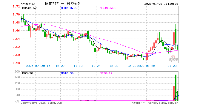 1月28日,截止午间收盘,疫苗ETF(159643)跌2.39%,报0.613元,成交额4273.08万元。疫苗ETF(159643)重仓股方面,复星医药截止午盘跌1.70%,长春高新跌1.43%,智飞生物跌2.41%,沃森生物跌2.97%,万泰生物跌2.18%,华兰生物跌2.22%,昭衍新药跌1.40%,丽珠集团跌1.93%,辽宁成大涨2.39%,康泰生物跌2.59%。