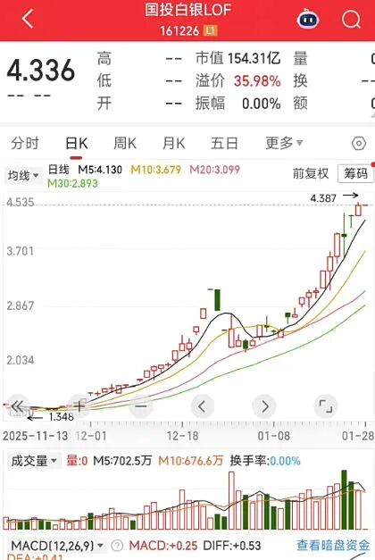 数据显示,1月27日,国投白银LOF复牌后冲高最高触及4.387元,再创历史新高,报收于4.336元,涨3.66%。