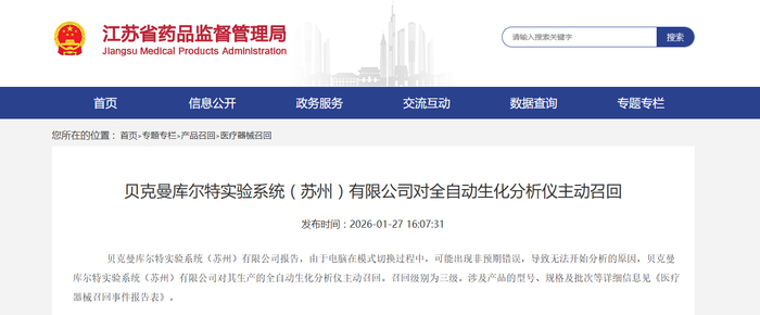贝克曼库尔特实验系统(苏州)有限公司对全自动生化分析仪主动召回